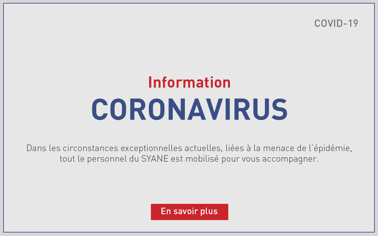 Dans les circonstances exceptionnelles actuelles, liées à la menace de l’épidémie engendrée par la COVID-19, tout le personnel du SYANE est mobilisé pour vous accompagner pendant cette période en appliquant les mesures de prudence.